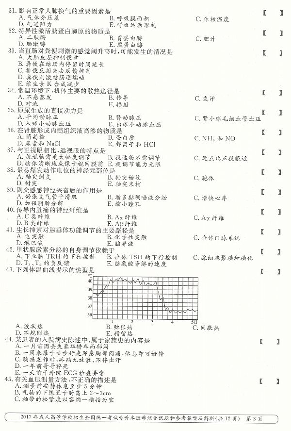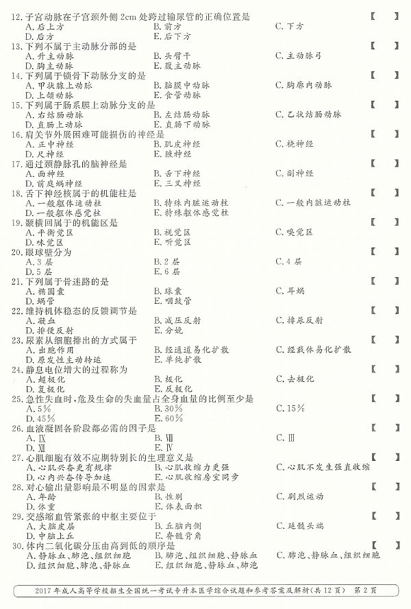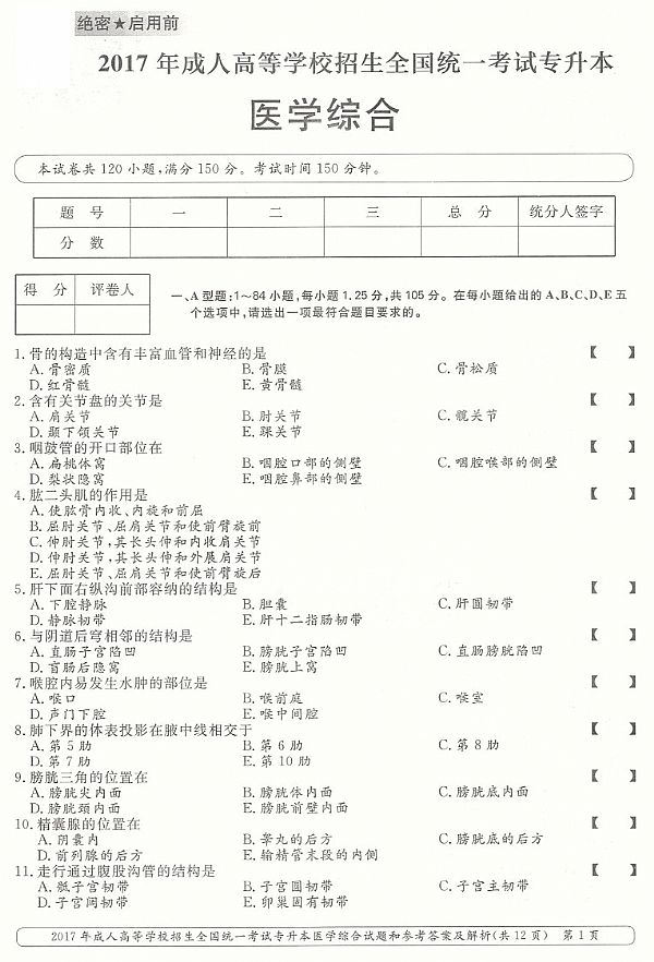 2017年成人高考专升本《医学综合》真题及答案
