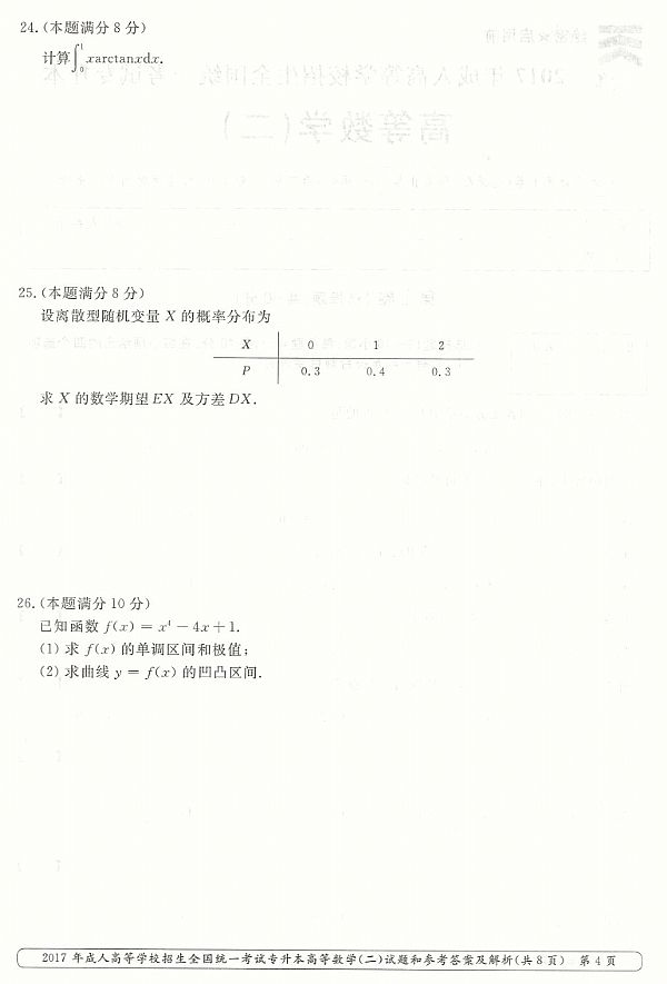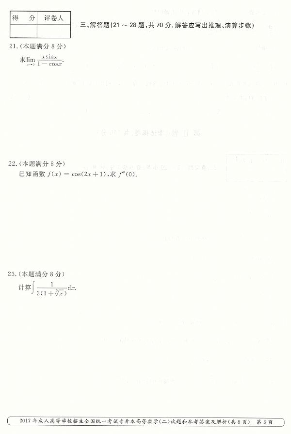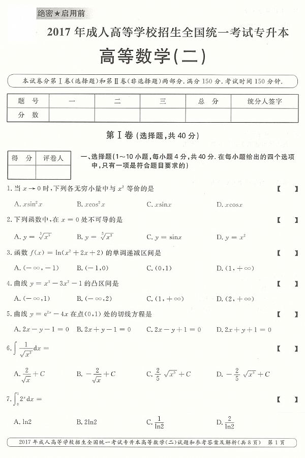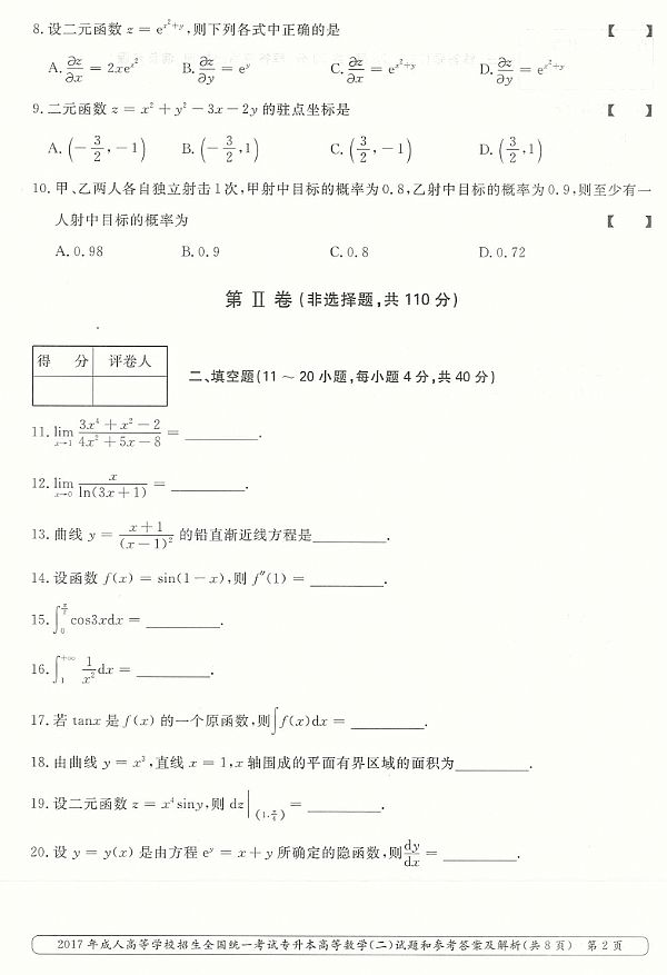 2017年成人高考专升本《高等数学(二)》真题及答案